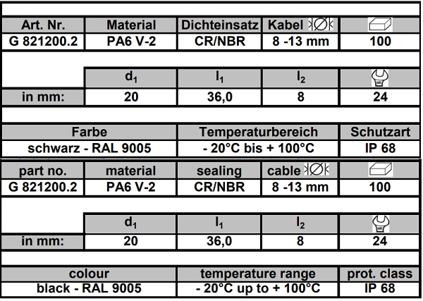 cable entry protection with gland fitting and neoprene sealing insert terminal area 8-13 mm polyamide PA 6 self-extinguishing class V2 (UL 94) insert protection IP 68 black