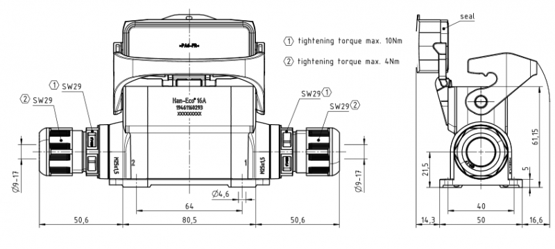 Han-Eco A 16A surface mounted housing, with thermo-plastic cover, integr. cable gland, side entry, 2xM25