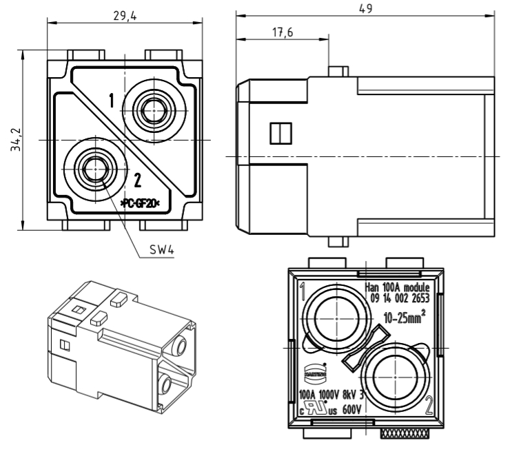 Han 100 A Modul, Stifteinsatz, Axialschraubanschluss, 10 - 25mm²