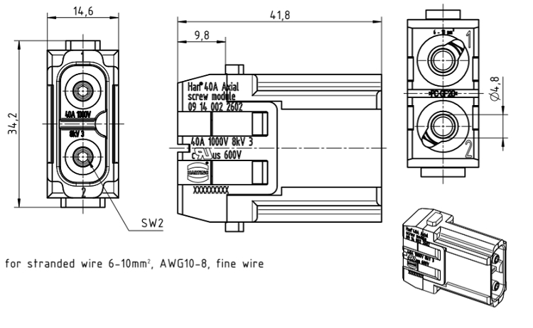 Han 40 A module, male, axial screw, 6 - 10mm˛