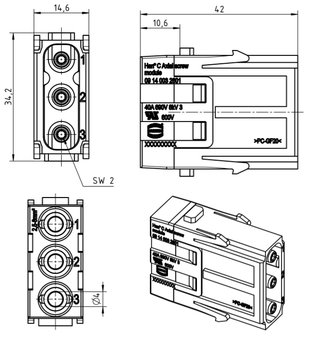 Han C module male insert, 2,5 - 8mm˛, axial screw