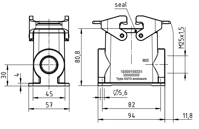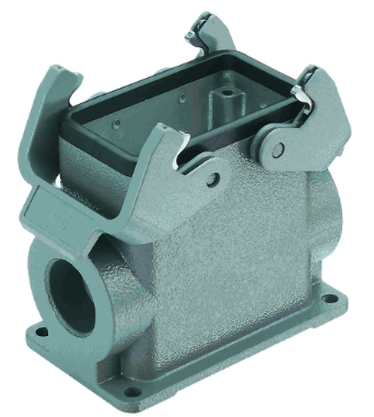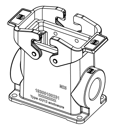 Han 10B Sockelgehäuse, seitlicher Kabeleingang, 1xM25, Querbügel, hohe Bauform