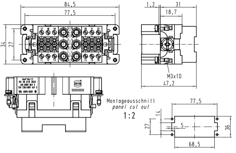 6 Lastkontakte + 12 Signalkontakte + PE, 6 - 10 und 0,2 - 2,5 mm²