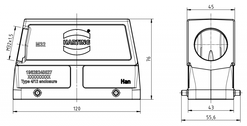 Han EMV/B 24B Tüllengehäuse, seitlich, 1xM32, Querbügel, hohe Bauform