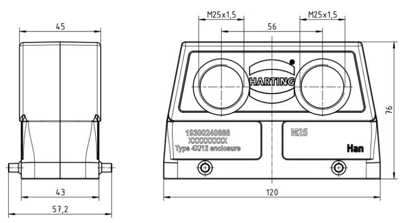 Han 24B Tüllengehäuse, gewinkelter Kabeleingang, 2xM25, Querbügel, hohe Bauform