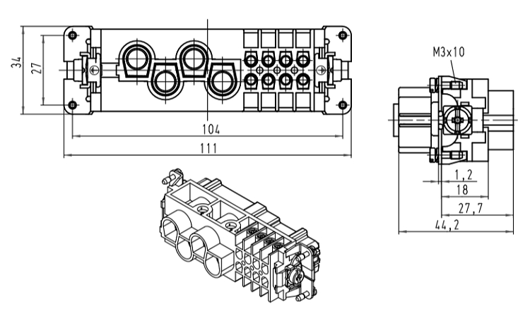 4 Lastkontakte + 8 Signalkontakte + PE, 1,5 - 16 & 0,5 - 2,5 mm²