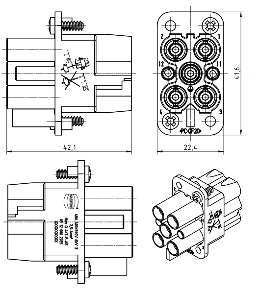 4 Leistungskontakte + PE, 2,5 - 6 mm², 40 A / 400/690V, Axialschraub