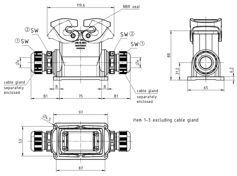 Han-Eco B 10B Sockelgehäuse, integr. Kabelverschraubung, seitlicher Kabeleingang, 2xM25