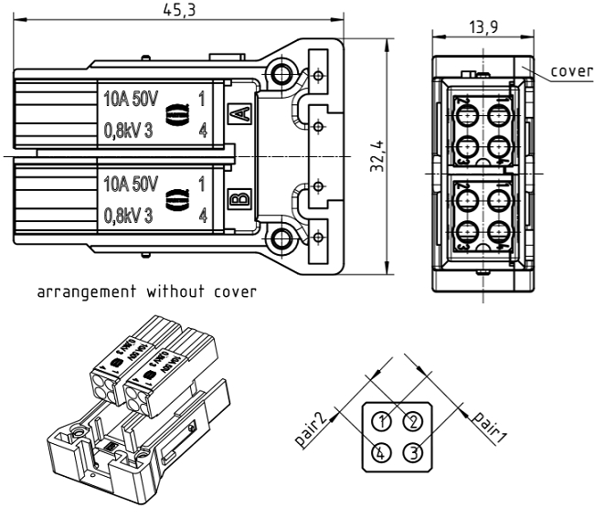 2 x 4 contacts, 1 cable entrie + shielding, 10 A / 50 V