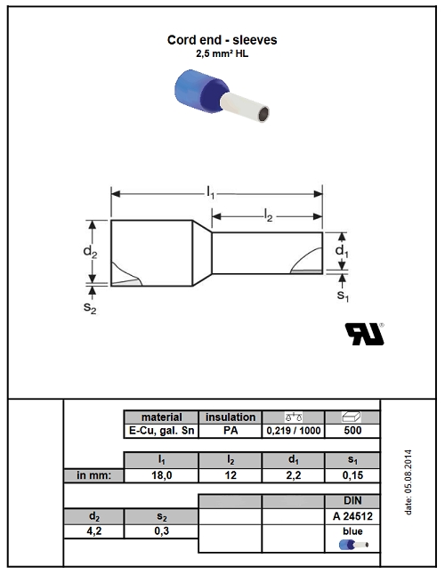 Aderendhülsen DIN 46228 Teil 4 DIN 2,5 mm² HL blau, 500-er VE