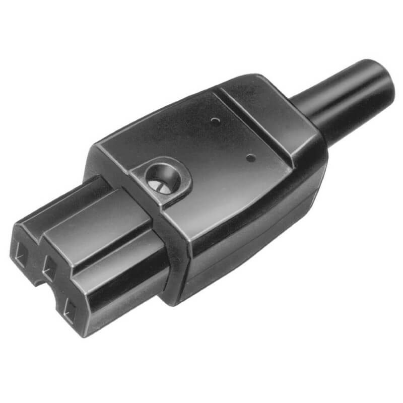 2-pol. mit Schutzkontakt, EN 60 320, Normblatt C 15A. Gehäuse schwarz, mit Knickschutztülle.